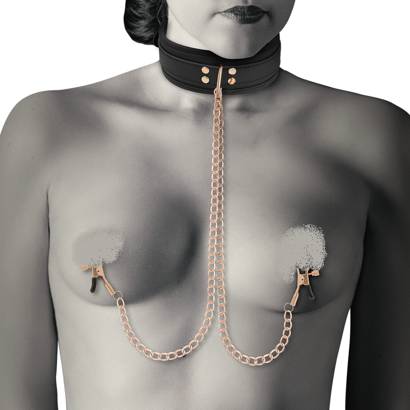 Crafted from soft vegan leather and finished with two chain nipple clamps, this clip collar set secures your subject instantly.